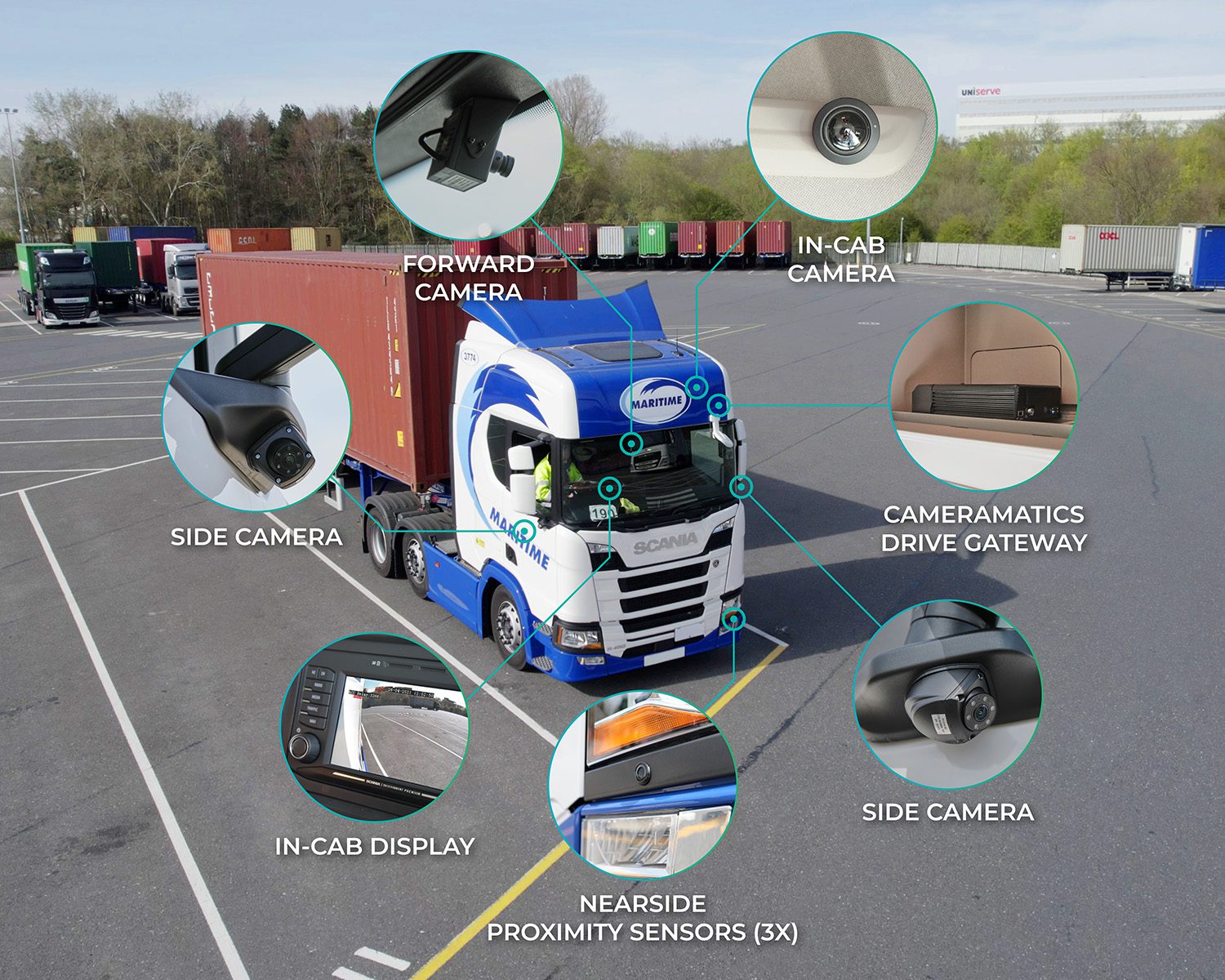 CameraMatics ticked all the boxes for Maritime. The 360˚ camera solution, along with Direct Vision Standard compliant exterior sensors and turning alerts, significantly increases the driver’s visibility and alerts other road users to the presence of an HGV. The nearside camera is neatly integrated into the vehicles’ onboard infotainment system screen too.